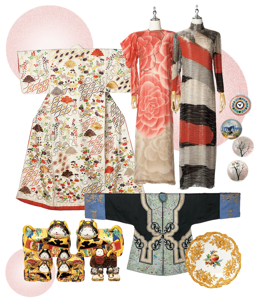 このミュージアムでは、黒栁徹子の感性と人生を映す「黒栁徹子コレクション」を展示しています。ガラスのペーパーウエイト、華やかな着物、版画や油絵、犬筥、中国の宮廷服、世界各地から集められた陶磁器、バッグや小物、さまざまな場面で着用したドレスや衣装、彼女の足跡を表すような貴重な資料など、多彩な品々が並びます。